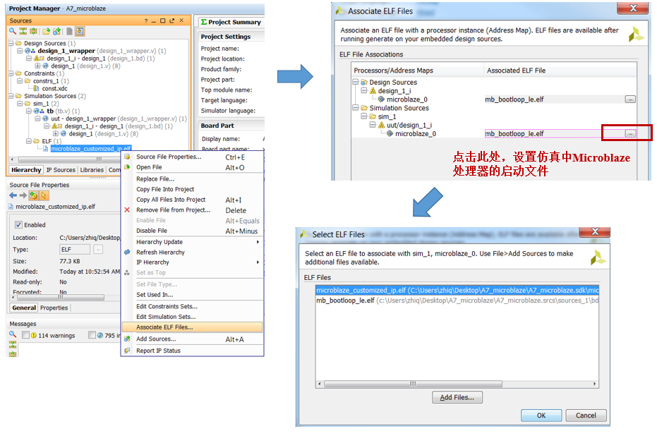 Step4:将导入的elf文件链接到对应的处理器,使其作为该处理器的启动程序。注意,elf文件只允许associate至Microblaze,工具不支持链接到ZYNQ。