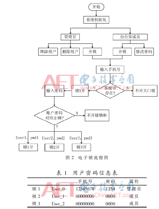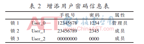 若将此智能电子锁应用于办公室,锁A是办公室大门,锁1、锁2、锁3是用户1、用户2、用户3的储物柜。若用户输入的手机号存在于该系统中,则办公室大门打开,再输入密码,若用户和密码与某一个储物柜匹配,则该储物柜打开,如图2所示。该系统的电子锁对应的用户密码信息保存在一张动态表中,如表1所示(初始化的用户密码信息表)。此表会随着管理员增添用户、删除用户以及成员管理员修改密码而实时更新[2]。