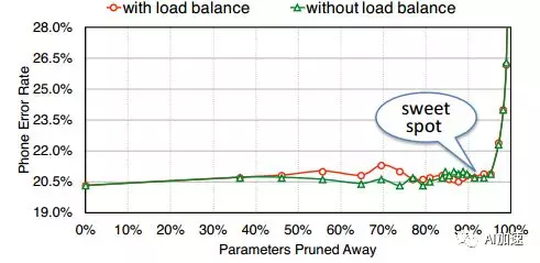 为了提升计算效率,降低等待时间,最理想情况是每行的有效权重数据相同,这样就不需要进行等待了。如右图,仅仅每行计算都需要三个时钟周期。计算效率100%。在进行训练的时候,就需要添加约束条件使得每行具有相同的有效权重数。从结果看出,这样处理在能够加速硬件的同时,还可以保持不变的精度。