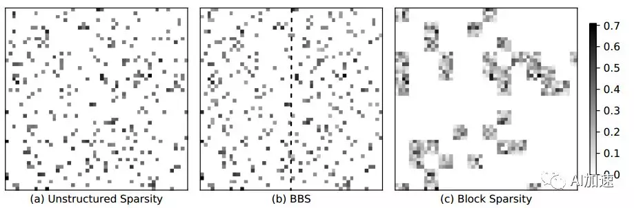 提出bank-balanced结构是为了解决fine-grained结构中数据随机不对齐的问题。将权重矩阵每行分割成bank单元,让每个单元中的有效权重数据数量相等。对比fine-grained和coarse-grained稀疏化,fine-grained可以将参数压缩的很高,但是导致权重分布不均匀,而coarse-grained能够获得均匀的权重结构,但是精度下降很大。Bank-balanced结构既有分布均匀的权重,同时又能够保持精度。