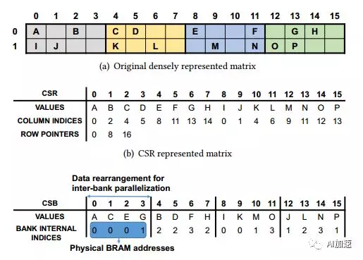 稀疏化后的矩阵是需要经过编码的,这样才能确定其在矩阵中位置。编码方式比较流行的有CSR,COO以及CSC等。但是他们一般都是用两个指数(比如行号和列号)来表示数据位置,这会额外增加数据负重。本论文中针对BBS结构设计了一种灵活简洁的编码:CBS。其由两行组成。第一行将数据重新排列,取出每个bank中第一个非零数据一次排列,然后再取出第二个bank中非零数据。第二行由数据所在的bank内位置决定。这个位置指标可以用于后边取得向量数据的bram地址。