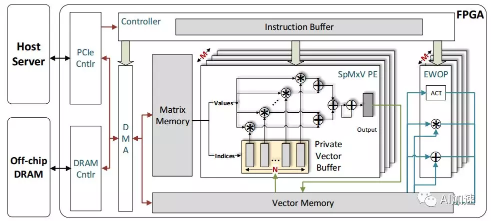 FPGA上的结构主要有:和CPU通信的PCIE控制,读写DDR的控制接口,输入输出缓存,加速计算单元,指令控制和调度。其中加速单元是核心模块,其中包括了稀疏矩阵乘法,累加,激活函数等操作模块。