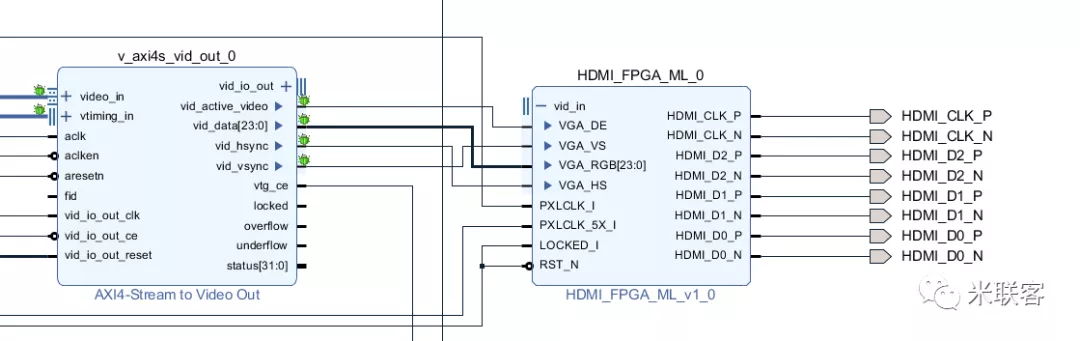 HDMI接口:对于HDMI接口的LCD屏,Video Out IP后面接HDMI_FPGA_ML IP,将RGB信号转换为HDMI信号输出。