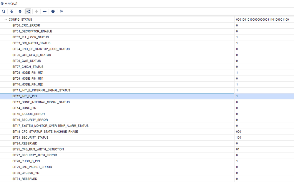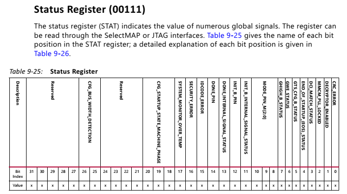 只有BIT02 PLL_LOCK, BIT03 DCI_MATCH, BIT11 INIT_B_INTERNAL, BIT12 INIT_B_PIN的值必须是1;