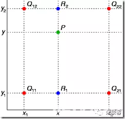 首先在x方向进行线性插值,得到R1和R2,然后在y方向进行线性插值,得到P。