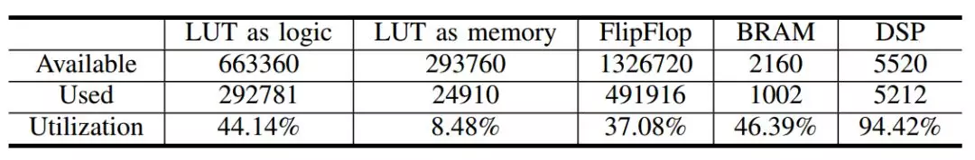 AIX使用了Xilinx Kintex Ultrascale KCU1500板卡,板卡包括一个KU115芯片,4块4GB DDR4-2400的DRAM,每块芯片有64个DQ引脚。最大可以支持76.8GB/s的带宽。KU115芯片资源如下: