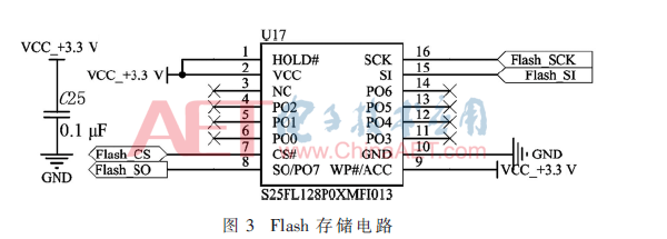 数据采集完成后,将相应通道的采样数据发送到监视器进行实时显示和存储到Flash闪存中,等待外部控制器发送读取命令。本系统采用ST公司的S25FL128P Flash存储器进行实时存储。该芯片存储容量为128 Mbit,通过SPI接口与外部控制器建立通信,接口的时钟频率最大可达到104 MHz。该芯片具有设计简单、存储数据稳定和价格低廉等特点,具有广泛的实用性。Flash存储电路如图3所示。