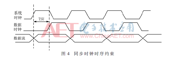 由于A/D采样和Flash数据存储时钟均为50 MHz,而数据处理和RAM缓存读写控制的时钟均为100 MHz。因此,为了保证系统各模块之间数据传输与处理的同步性,本系统采用FPGA内部的锁相环(Phase Locked Loop,PLL)IP核倍频或分频生成100 MHz和50 MHz的时钟。通过调用锁相环设计出一个具有低抖动、低延迟的系统时钟,保障了高速采集系统运行更加稳定[5-6]。与大多数时钟同步方案不同,该系统同步时钟模块除了使用PLL之外,还要通过时序约束的方式来减小数据与时钟之间偏斜,重新建立时钟偏斜的保持时间(Time Setup,TSU)如图4所示。通过时序约束不仅能实现系统时钟同步,还能避免出现数据传输错误。