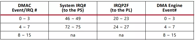 DMAC支持16个事件,开始的8个事件是中断信号,IRQs[7:0],这8个中断都会输出到PS或者PL的中断控制器。这些事件使用内部的DMA引擎通道与通道之间的传输。EMAC的中断事件表如图3所示。