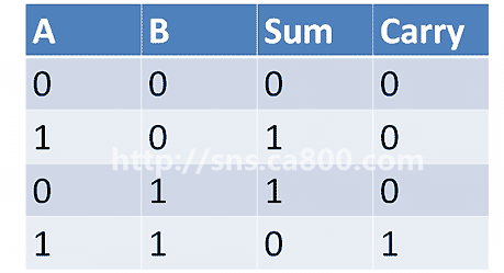这张表就叫做"真值表"(truth table),其中的sum表示"和位",carry表示"进位"。