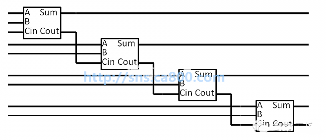 然后,将四个全加器串联起来,就得到了四位加法器的逻辑图。