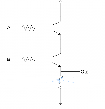 接着是AND。这需要两个晶体管,只有当两个基极的输入都为1(高电平),电流才会流向输出端,得到1。