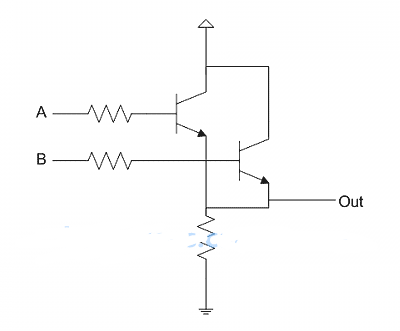 最后是OR。这也需要两个晶体管,只要两个基极中有一个为1(高电平),电流就会流向输出端,得到1。