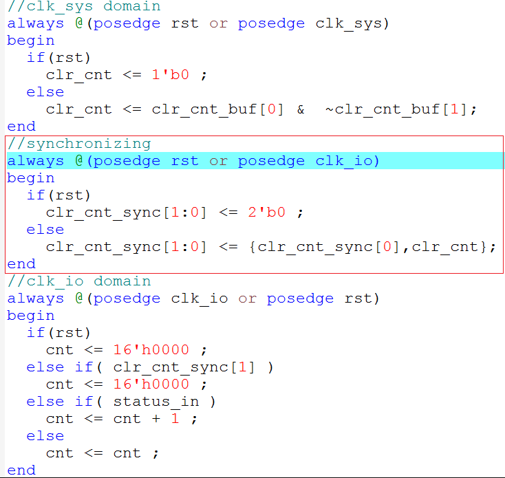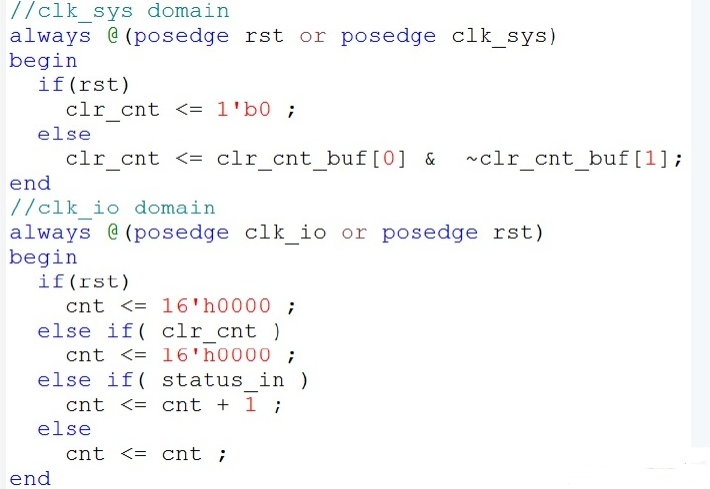 很明显,这里有一个问题,就是异步时钟域处理的问题。’clr_cnt’的时钟为’clk_sys’,而”cnt”的时钟为’clk_io’, ‘clk_sys’和’clk_io’是异步的,没有确定的相位关系。