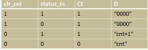 图3中,可以看到,’clr_cnt’和’status_in’相或的结果控制触发器的使能端(‘CE’)。另外,’clr_cnt’还决定了触发器输入(‘D’)是”cnt+1”还是”0”。真值表如下。