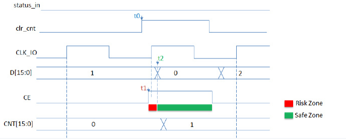 为了说明问题方便,定义 ‘clr_cnt’ 跳变的时刻为t0,这个跳变事件传播到触发器’CE’端的时刻为t1, 传播到触发器’D’端的时刻为t2。见图4。