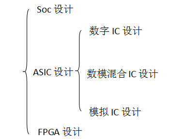 IC也就是集成电路,通俗的讲也就是芯片了。我觉得芯片设计在现在来看,主要有Soc芯片设计、ASIC设计、FPGA设计,如下图所示:
