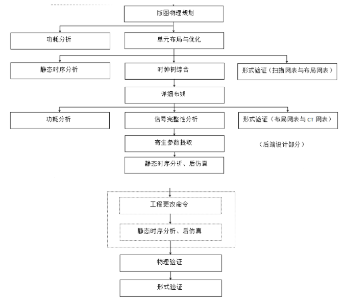 设计流程大概有下面这些步骤:系统总体规划、模块设计、顶层模块集成、顶层功能模块验证、逻辑综合、形式验证、静态时序分析、可测性设计插入、芯片版图物理规划、功耗分析、单元布局与优化、时钟树综合、布线、信号完整性分析、寄生参数提取、后仿真、工程更改命令、物理验证。用下图表示流程可能更清晰一点: