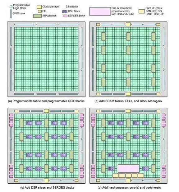 图1:最简单的FPGA仅包含可编程结构和可配置GPIO(a),不同架构是在此基本结构上增加其他元件而形成:SRAM块、PLL和时钟管理器(b),DSP块和SERDES接口(c),以及硬处理器内核和外设(d)。(图片来源:Clive“Max”Maxfield)