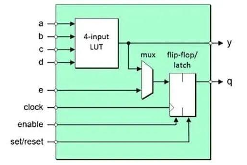 多路复用器的输出馈入寄存器输入。每个寄存器都可以配置为边沿触发的触发器或电平敏感锁存器(尽管如此,但不建议在FPGA内部使用锁存器形式的异步逻辑)。每个寄存器的时钟(或使能信号)可以配置为高电平有效或低电平有效。同样,置位/复位输入的有效电平也是可配置的。
