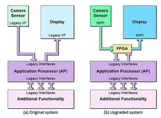 一个简单的例子是在其他使用不同接口标准或通信协议的器件之间提供智能接口。请考虑一个现有系统,其中有一个应用处理器使用旧式接口连接到相机传感器和显示设备(图3a)。