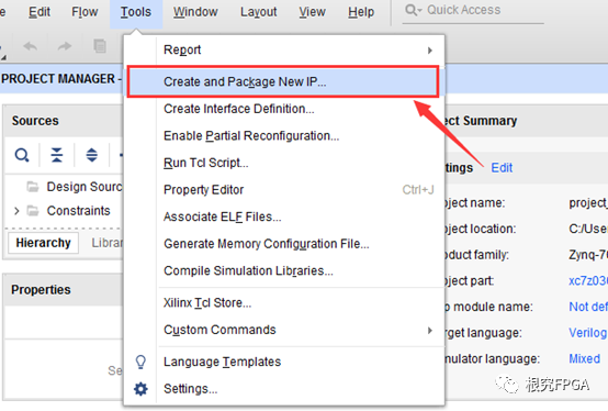 如果不慎将初始的IP封装界面关掉的话,在Tools下选择Create and Package New IP,选择Package your current project,NEXT之后选择open(你会看到的)。