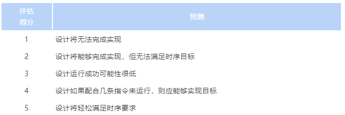 评估得分用于预测设计满足其 QoR 目标的可能性高低。它可在实现的任意阶段生成,但鉴于其前瞻性的本质,它适合在设计完全完成布线之前使用,并且在执行 opt_design 后生成的评分值最高。