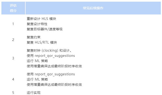 QoR 评估得分可使用 Report QoR Suggestions (RQS) 来加以改善,但这并不适用于所有设计。为了对得分 2(或低于 3)的设计进行改进,可能需要大量工作,例如,对 HLS 模块进行最优化、HDL 重新编码、变更 IP 配置等。