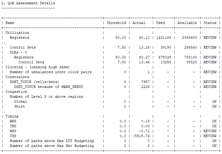 对于超出阈值的任何项,都会在其旁边添加 REVIEW 标记。阈值并非硬性限制,但可作为指导。这些阈值可帮助您洞悉设计中出现 QoR 下降的时机。如果只有某一个项略超阈值,那么您可以预判它对自己的设计影响有限。但如果有许多因子都略超阈值,或者如果某一个问题显著超出阈值,那么您几乎可以肯定设计中将出现问题。