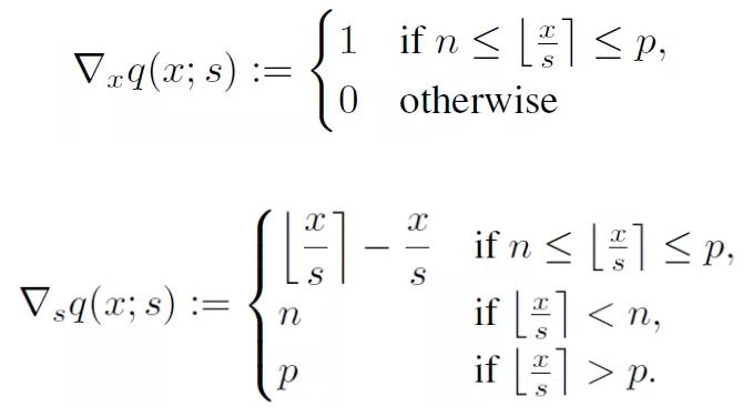 由于s和x都是需要训练的参数,所以我们需要求得他们的梯度值,梯度值比较简单,对q(x, s)的x和x进行求导,有: