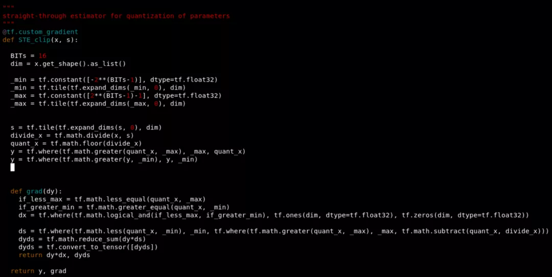 量化第一步是需要将量化插入到tensorflow的图结构中,即在要量化的权重数据之后。这需要重新定义op和梯度,tensorflow中提供了tf.custom_gradient装饰函数来对梯度和op进行定义,所以我定义了如下梯度: