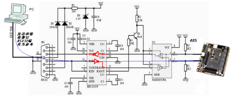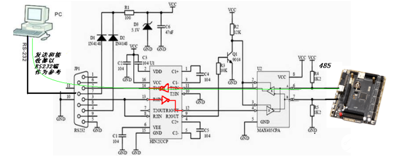 以RS232端作为参考端,在接收时,数据从RS485端向左通过转换电路中绿线所示的通路流向RS232端。处于接收状态的接收端,不会发送数据,也就是处于等待状态,此时TX管脚输出逻辑1(协议规定)。TX在串口公口上对应的引脚是管脚3,RS232是负逻辑,所以输出-12V,经过反相调整后输出TTL高电平,约4.6V。再经过三极管的Q1反相,输出低电平,RE、DE都为低电平的时候,MAX485处于接收状态。