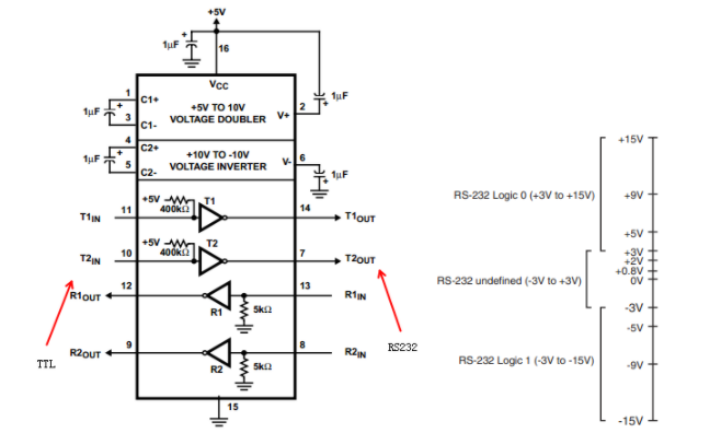 在正式分析之前,先看一下HIN232的结构框图,有助于我们接下来的分析。当然此结构图也就是电平转换,但需要注意的是信号的流向,从哪儿进来,又从哪儿出去。此外,RS232是负逻辑电平,我们可以认为逻辑“1”的时候,RS232对应的是-12V;逻辑“0”,RS232对应的是+12V。