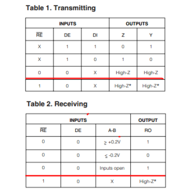 MAX485发送和接收逻辑电平转换关系表