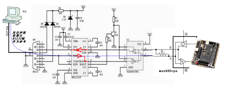 发送的情况有些复杂,需要耐心分析。数据从RS232端向右通过转换电路中蓝线所示的通路流向RS485端。当输出逻辑低电平,TX(3管脚)对应输出+12V,经过反向调整输出TTL低电平,约0.4V。再经过三极管的Q1反相,输出高电平,RE、DE都为高电平的时候,MAX485处于发送状态,可以正确的将逻辑低电平发送。