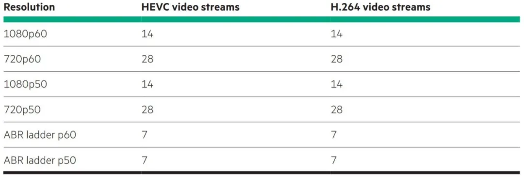 该服务器配置了 7 个 U50 用于编码、1 个 U50 用于 H.264 解码和缩放,能够支持视频流分辨率和全部 ABR 阶梯,如下表所示: