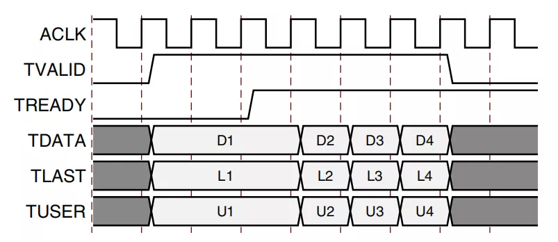 图2显示了在AXI4-Stream通道中的数据传输。TVALID由通道的源(主)端驱动,而TREADY由接收器(从属)驱动。TVALID指示有效负载字段(TDATA,TUSER和TLAST)中的值有效。TREADY表示从机已准备好接收数据。当一个周期中的TVALID和TREADY均为TRUE时,将发生传输。主机和从机分别为下一次传输分别设置TVALID和TREADY。