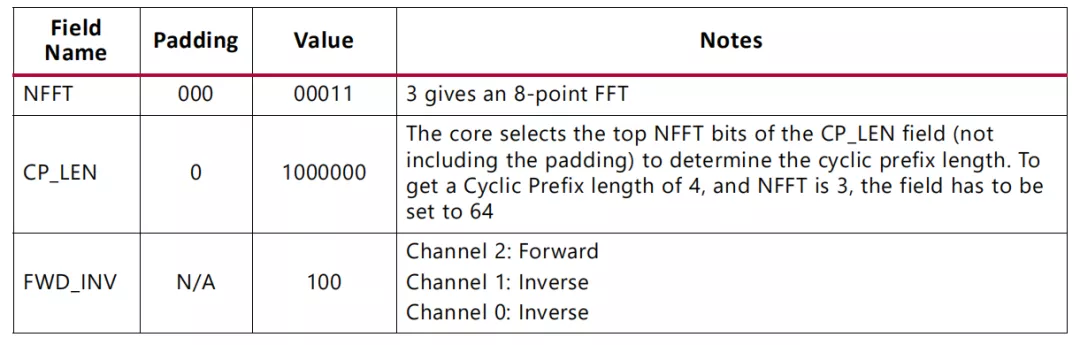内核具有可配置的转换大小,最大大小为128点,具有循环前缀插入和3个FFT通道。内核需要配置为执行8点变换,并在通道0和1上执行逆变换,并在通道2上执行前向变换。需要4点循环前缀。这些字段采用表中的值。