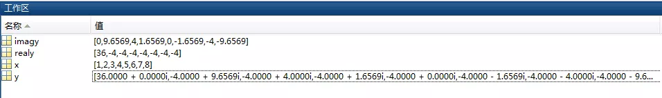 Y的实部输出为realy=[36,-4,-4,-4,-4,-4,-4,-4];