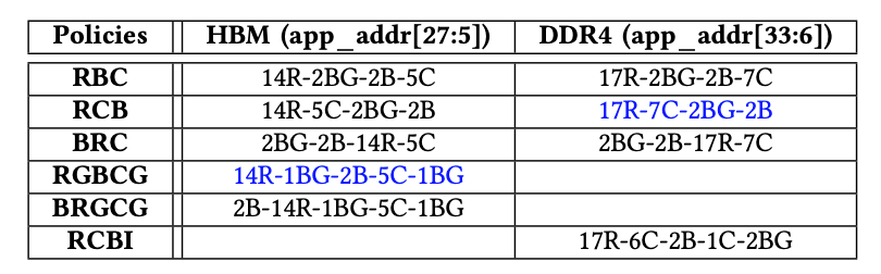 可以使用多种策略将应用程序地址映射到内存地址,其中不同的地址位映射到存储块,行或列地址。选择正确的映射策略对于最大化整体内存吞吐量至关重要。表II中汇总了为HBM和DDR4启用的策略,其中“ xR”表示x位用于行地址,“xBG”表示x位用于存储体组地址,“ xB”表示x位用于存储体地址,“ xC”表示x位用于列地址。HBM和DDR4的默认策略分别为“RGBCG”和“ RCB”。“-”代表地址串联。如果没有特别指定,我们始终对HBM和DDR4使用默认的内存地址映射策略。例如,HBM的默认策略是RGBCG。