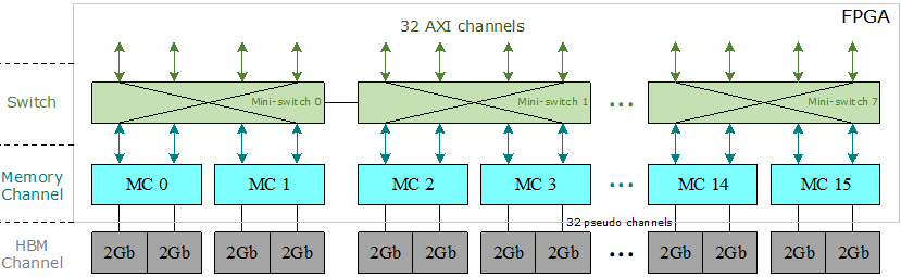 在16个存储通道的顶部,有32个与用户逻辑交互的AXI通道。每个AXI通道均遵循标准AXI3协议[44],以向FPGA程序员提供经过验证的标准化接口。每个AXI通道都与一个HBM通道(或伪通道)相关联,因此每个AXI通道仅被允许访问其自己的内存区域。为了使每个AXI通道都能访问整个HBM空间,Xilinx引入了在32个AXI通道和32个伪通道之间的switch[41],[44]。但是,由于其巨大的资源消耗,该switch尚未完全实现。相反,Xilinx提供了八个小型switch,其中每个小型switch为四个AXI通道及其相关的伪通道提供服务,并且在每个AXI通道都可以访问同一小型switch中的任何伪通道,该小型switch被完全实现。具有相同的延迟和吞吐量。此外,两个相邻的微型switch之间有两个双向连接,用于全局寻址。