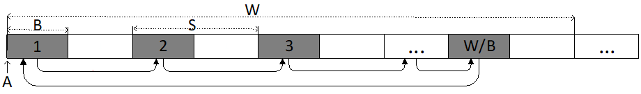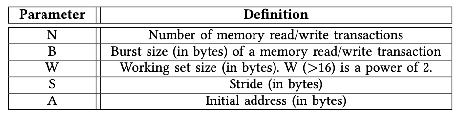 RST模式遍历一个存储区域,一个数据阵列按顺序存储数据元素。RST重复扫描起始地址为A的大小为W的存储区域,并且每次读取步长为S字节的B个字节,其中B和S为2的幂。在我们测试的FPGA上,访问大小B应为由于HBM / DDR4存储器应用程序数据宽度的限制,对于HBM(或DDR4),其值不得小于32(或64)。步幅S不应大于工作集大小W。参数汇总在表I中。我们计算出RST发出的第i个存储器读/写事务的地址T [i],如公式1所示。可以使用简单的算法来实现计算,从而减少了FPGA资源的数量,并可能实现更高的频率。尽管这公式非常简单,但是它能帮助我们了解FPGA上的HBM和DDR。