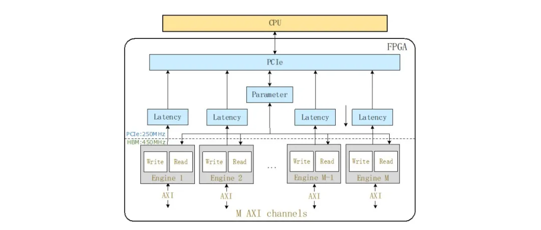 竖亥的硬件组件由一个PCIe模块,M个延迟模块,一个参数模块和M个引擎模块组成,如图3所示。在下面,我们讨论每个模块的实现细节。