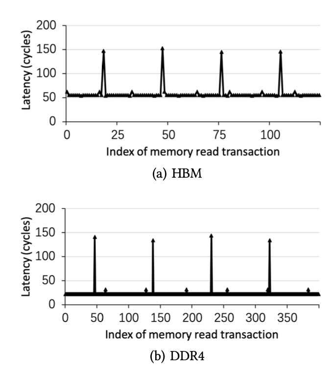 当存储通道正在运行时,应重复刷新存储单元,以使每个存储单元中的信息都不会丢失。在刷新周期中,不允许正常的内存读取和写入事务访问内存。我们观察到,经历内存刷新周期的内存事务比允许直接访问内存芯片的普通内存读/写事务的等待时间长得多。因此,我们能够通过利用正常和非刷新内存事务之间的内存延迟差异来大致确定刷新间隔。特别地,我们利用竖亥来测量串行存储器读取操作的延迟。图4说明了B = 32,S = 64,W = 0x1000000和N = 20000的情况。我们有两个观察结果。首先,对于HBM和DDR4,与刷新命令一致的存储器读取事务具有显着更长的延迟,这表明需要发出足够多的动态存储器事务来分摊刷新命令的负面影响。其次,对于HBM和DDR4,都定期计划刷新命令,任何两个连续刷新命令之间的间隔大致相同。