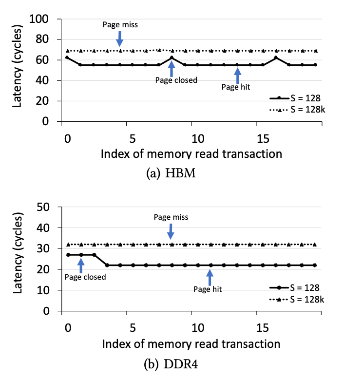我们使用情况S = 128来确定页面命中和页面关闭事务的等待时间。S = 128小于页面大小,因此大多数读取事务将访问一个打开的页面,如图5所示。其余点说明页面关闭事务的等待时间,因为小S导致大量读取特定内存区域中的事务。我们使用S = 128K的情况来确定页面丢失事务的等待时间。S = 128K导致HBM和DDR4的每个内存事务发生页面丢失。