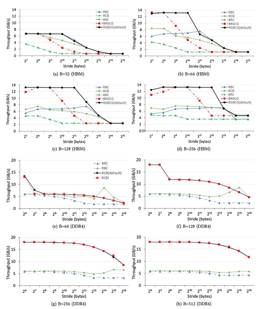首先,如图6a,6b,6c,6d所示,使用默认地址映射策略,HBM允许使用较大步幅,同时仍保持高吞吐量。根本原因是,即使由于大的S而没有充分利用每个行缓冲区,存储组级并行性也能够使我们饱和利用内存带宽。