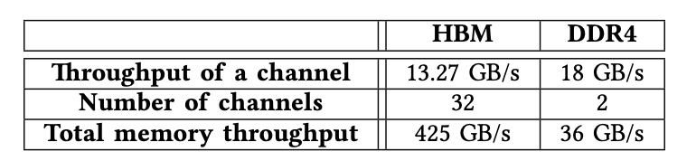 我们在Xilinx的Alevo U280 [43]上进行实验,该实验具有两个总容量为8GB的HBM堆栈和两个总容量为32GB的DDR4内存通道。理论HBM内存带宽可以达到450 GB / s(450M * 32 * 32B / s),而DDR4内存理论带宽可以达到38.4GB / s(300M * 2 * 64B / s)。