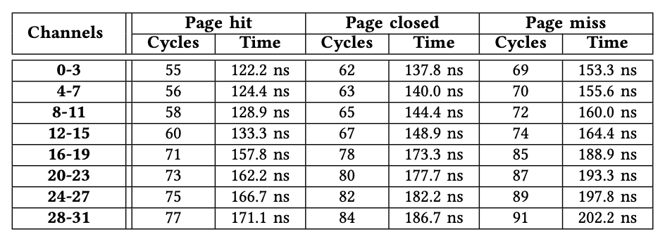 为了准确地测量内存延迟,当内存控制器处于“空闲”状态时,即内存控制器中不存在其他未决内存事务的情况下,我们利用竖亥来测量连续内存读取事务的延迟。以最小的延迟将请求的数据返回到读取的事务。我们旨在确定三种不同状态下的延迟:page hit、page miss、page closed。