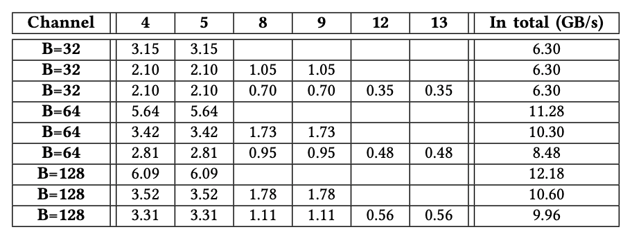 首先,延迟差异最多可以达到22个周期。例如,对于页面命中事务,来自AXI通道31的访问需要77个周期,而来自AXI通道0的访问仅需要55个周期。其次,来自同一微型switch中任何AXI通道的访问等待时间是相同的,这表明该微型switch已完全实现。例如,与AXI通道4-7关联的微型switch对所有通道都显示相同的内存访问延迟。我们得出结论,AXI通道应访问其关联的HBM通道或靠近它的HBM通道,以最大程度地减少延迟。