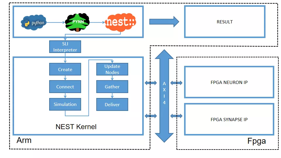 本系统由包含PYNN类脑框架、NEST仿真器、FPGA神经元和STDP硬件模块。如图2所示,顶层应用设计语言为Python,在PYNN架构协助下调用NEST仿真器,各种命令通过python interpreter和SLI interpreter解释后,进入NEST kernel。根据各种命令进行底层网络创建包括神经元创建、突触连接创建、仿真时间设置等。